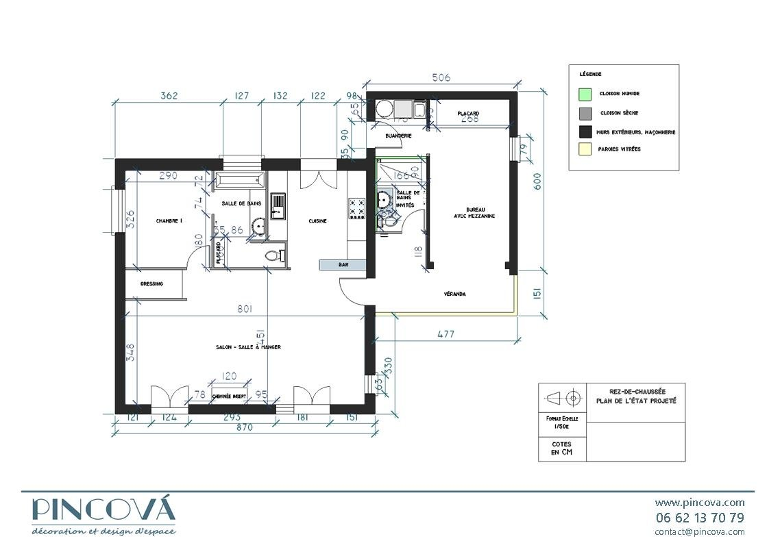 - des plans de l'état projeté 2D, élévations, coupes (avec implantation du mobilier),